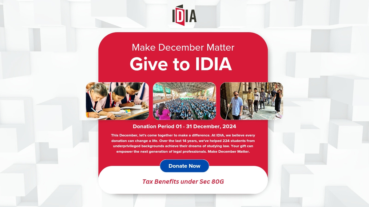 This December, let’s build a brighter future together. At IDIA, we believe in breaking barriers and empowering underprivileged students—irrespective of their gender, religion, disability, or background—to dream big. For 14 years, we've transformed 224 lives, enabling students from marginalized communities to pursue careers in law.